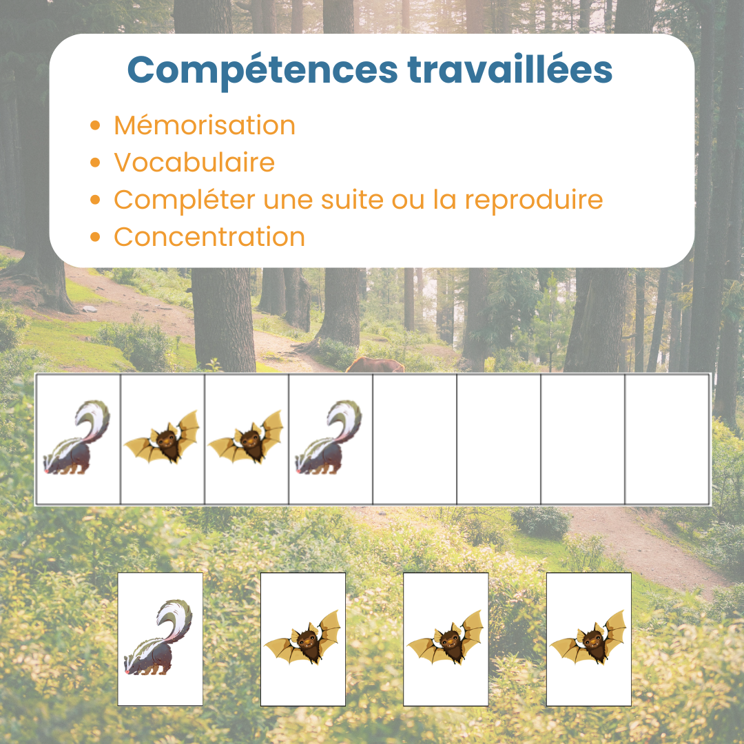 Ce jeu propose des cartes et supports visuels mettant en scène des animaux de la forêt à déplacer, ordonner ou associer selon une suite logique. L’enfant suit un chemin, une consigne ou une séquence à reproduire. Il expérimente, se trompe, corrige et recommence, à son rythme.