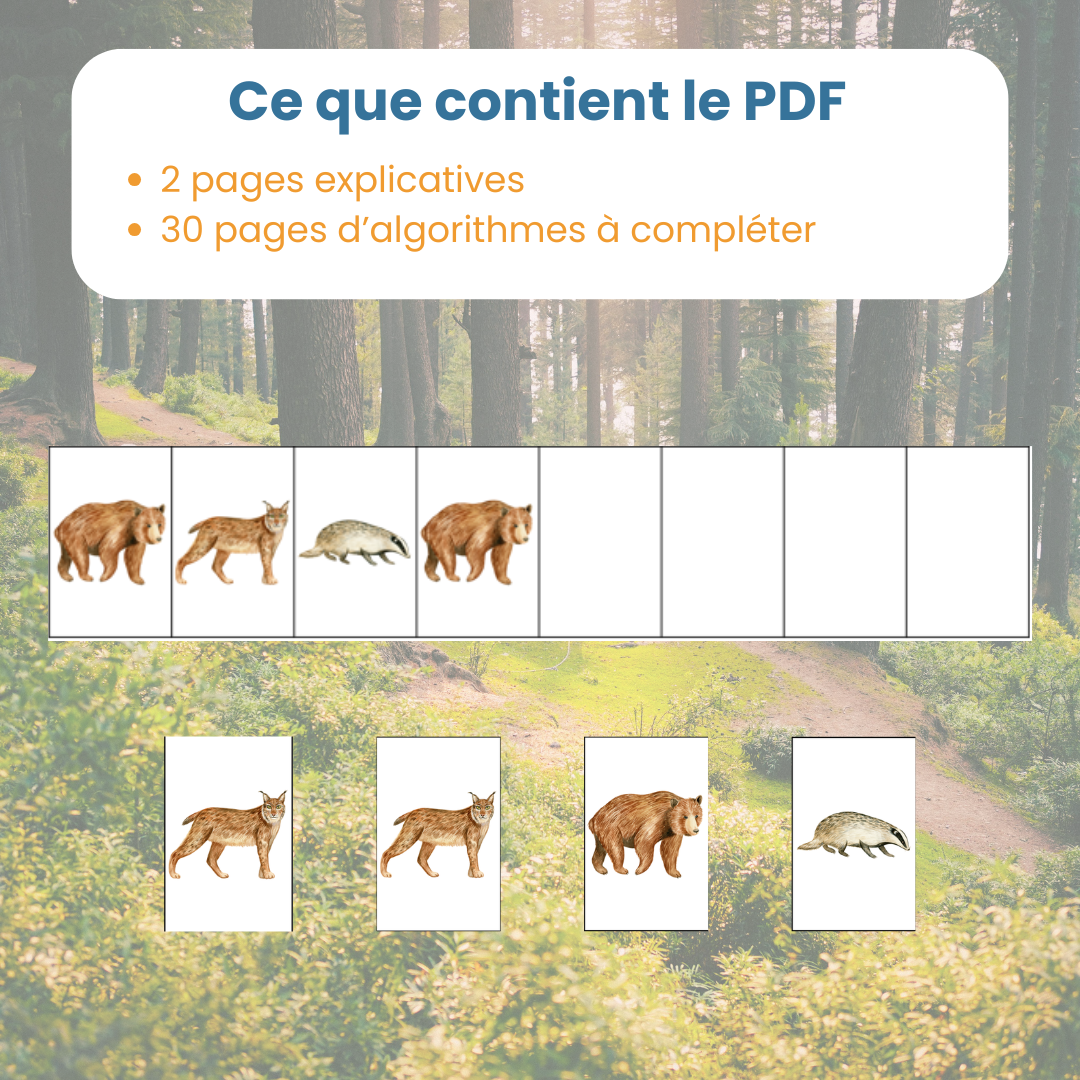 Jeu éducatif PDF autour des algorithmes animaux de la forêt pour initier l’enfant à la logique et à la programmation sans écran. Une activité ludique pour développer raisonnement, concentration et repérage spatial, à travers des consignes simples et visuelles. Téléchargement immédiat après achat.