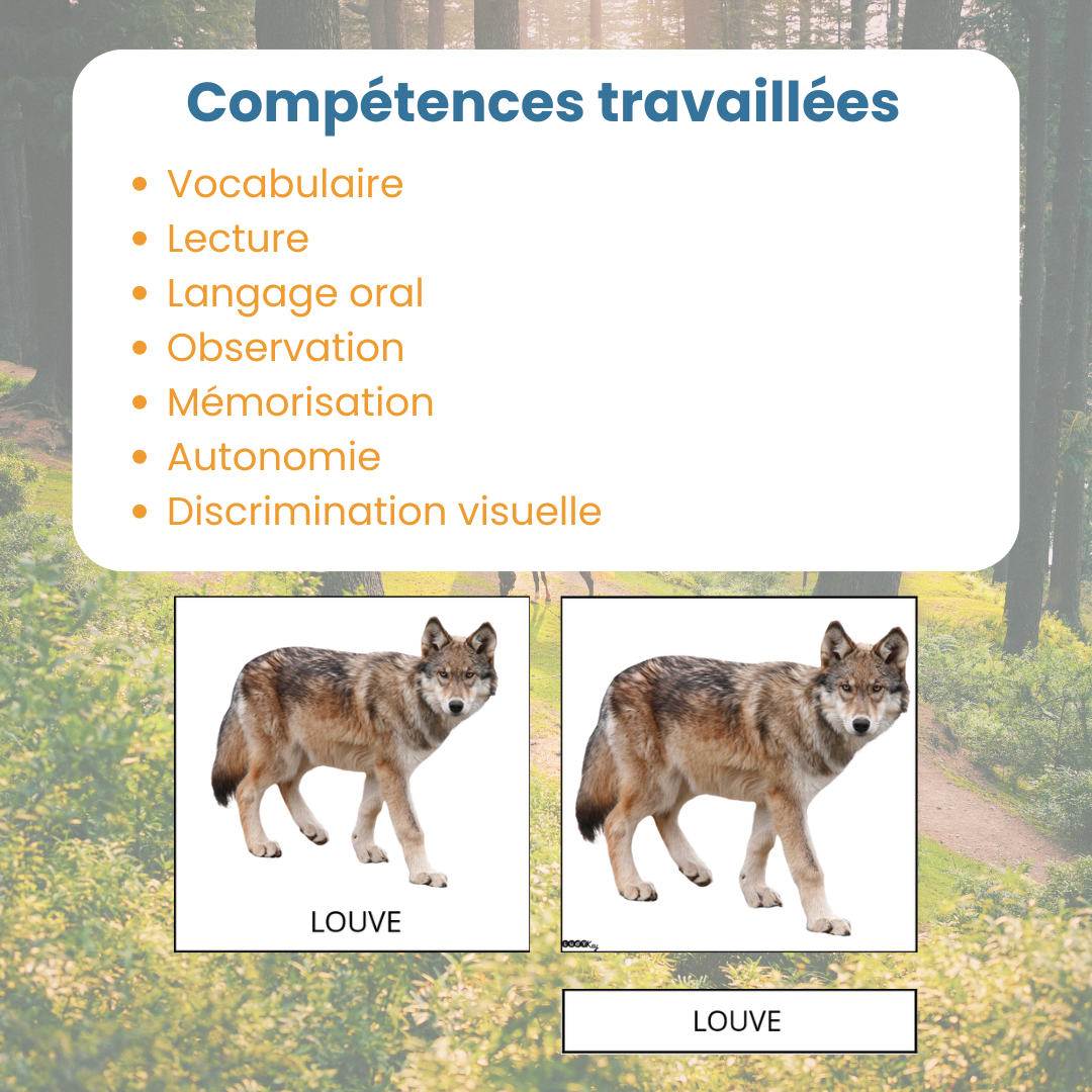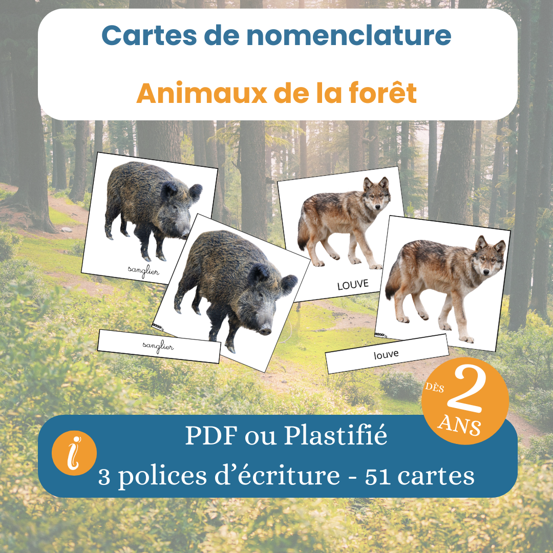 Les cartes de nomenclature animaux de la forêt sont un matériel Montessori incontournable pour accompagner l’enfant dans la découverte du monde vivant. Elles permettent d’enrichir le vocabulaire, de structurer le langage et de développer l’observation fine, tout en respectant le rythme naturel de l’enfant.