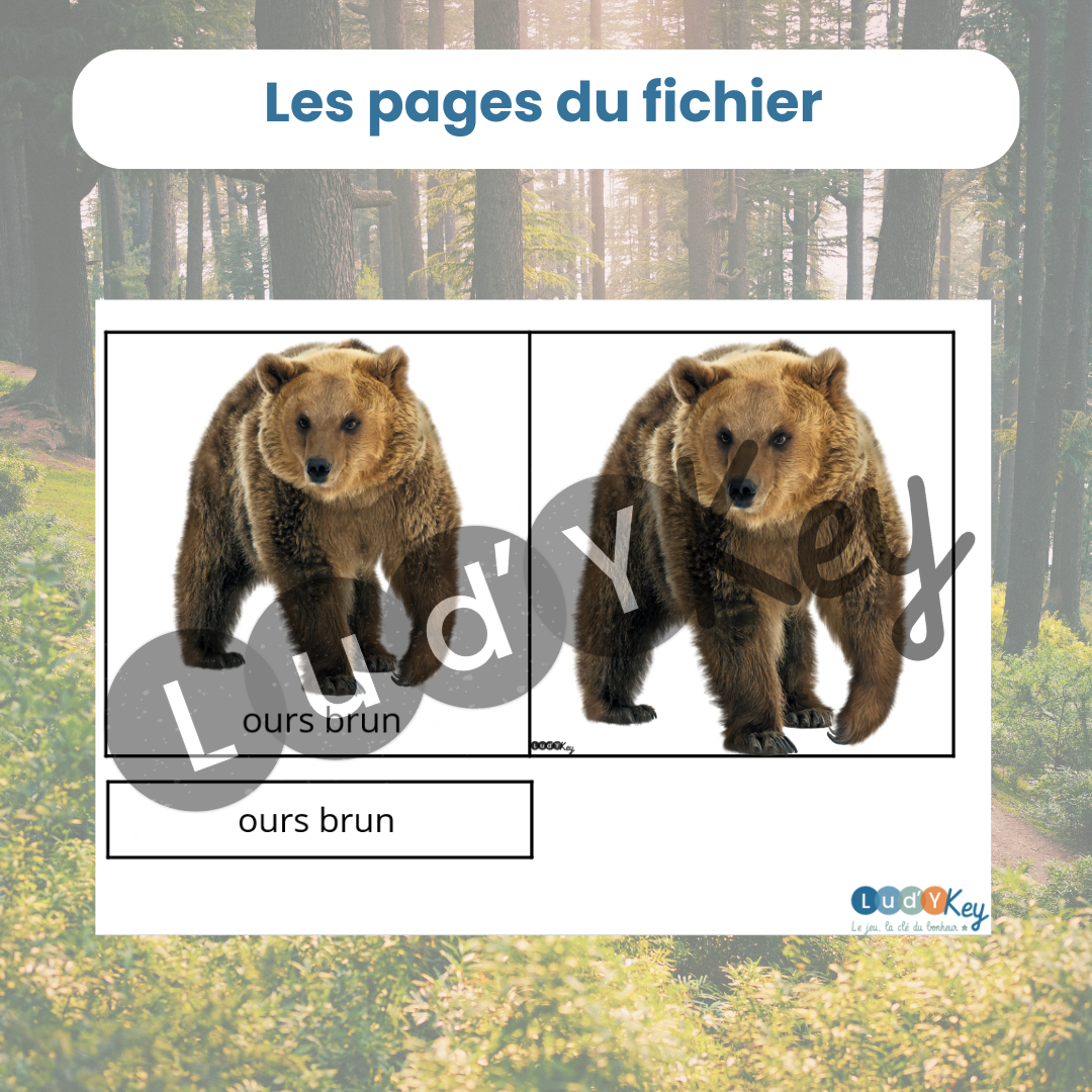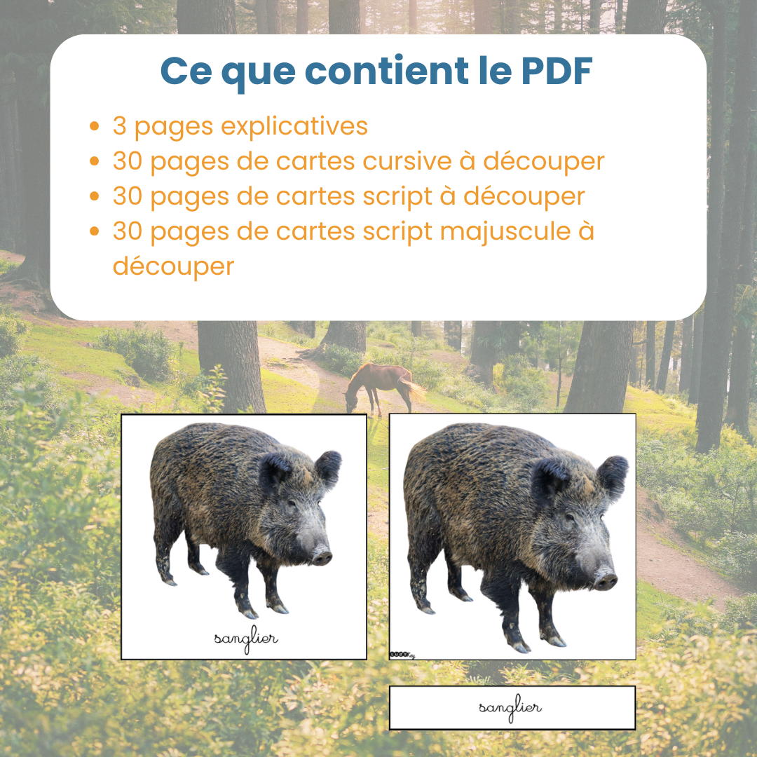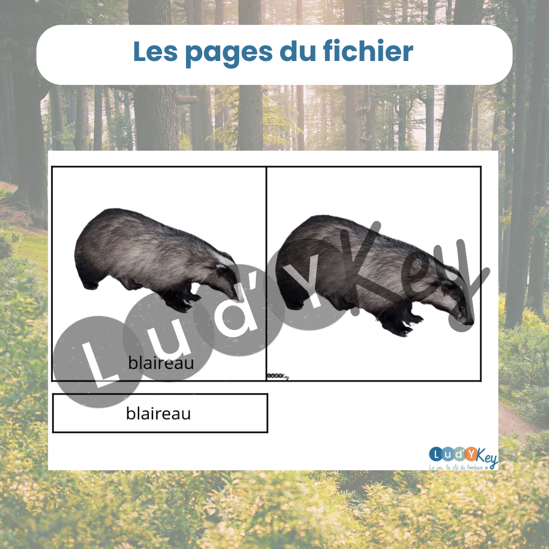 Ce fichier comprend 51 cartes de nomenclature sur le thème des animaux de la forêt, toutes au format 14 x 14 cm :