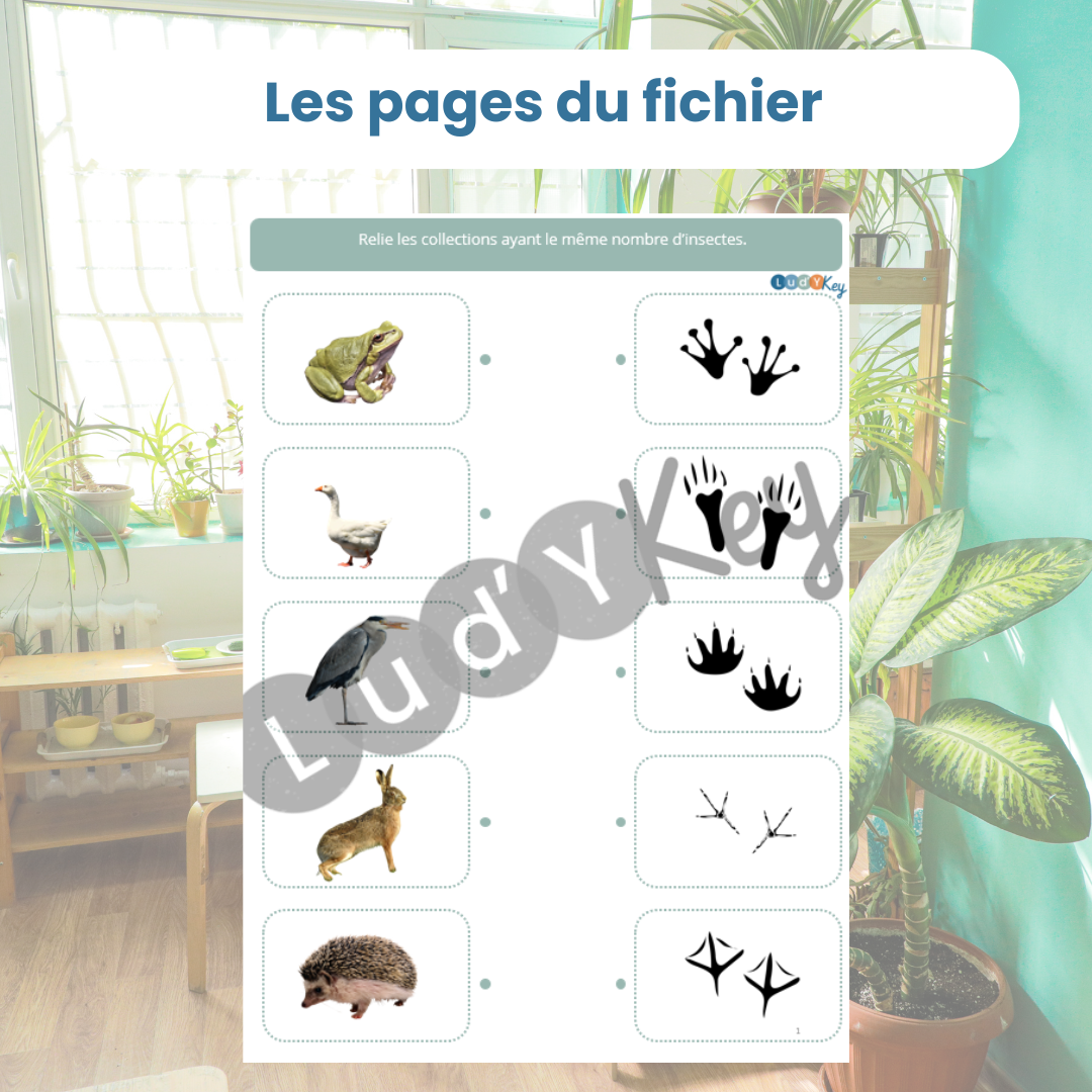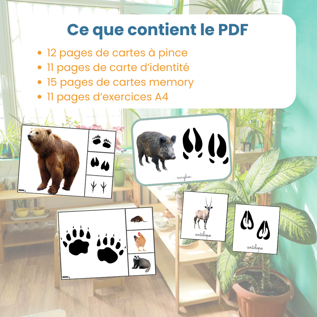 Ce jeu éducatif empreintes animaux permet à l’enfant d’observer, comparer et reconnaître les empreintes d’animaux grâce à des cartes à pince, un memory et des fiches. L’activité développe observation, logique et culture scientifique autour des traces animales.