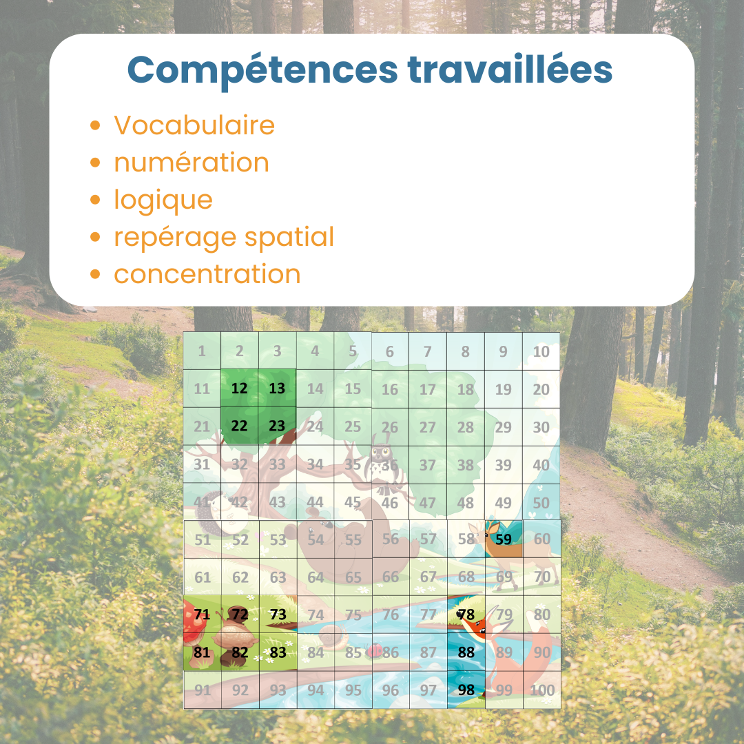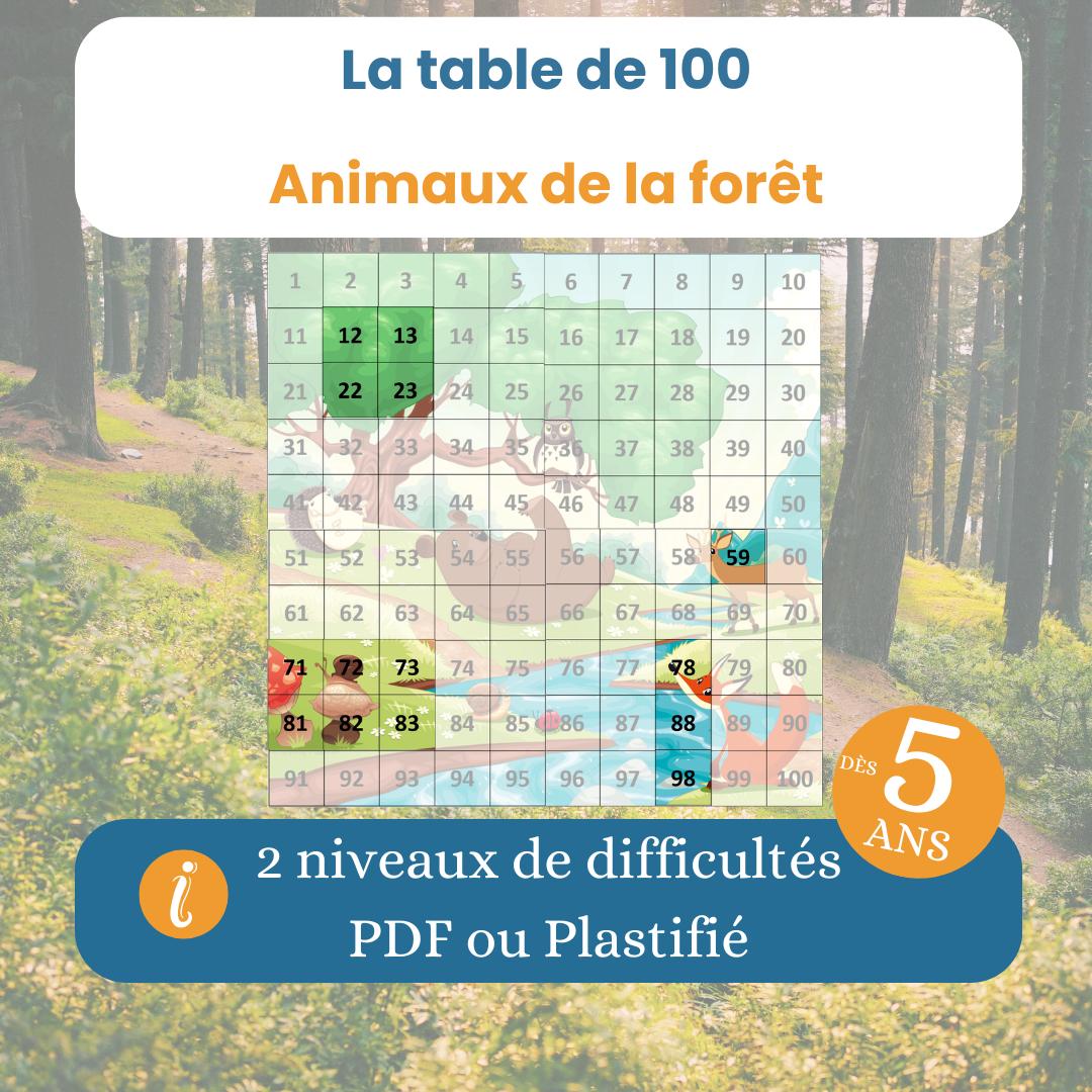 La table de 100 animaux de la forêt est un support ludique et visuel pour aider l’enfant à se repérer dans les nombres de 1 à 100. À travers une grande illustration découpée en cent cases, l’enfant manipule, observe et reconstruit le puzzle à son rythme. Cette approche concrète facilite la compréhension de la suite numérique tout en maintenant l’attention grâce à l’univers des animaux de la forêt.